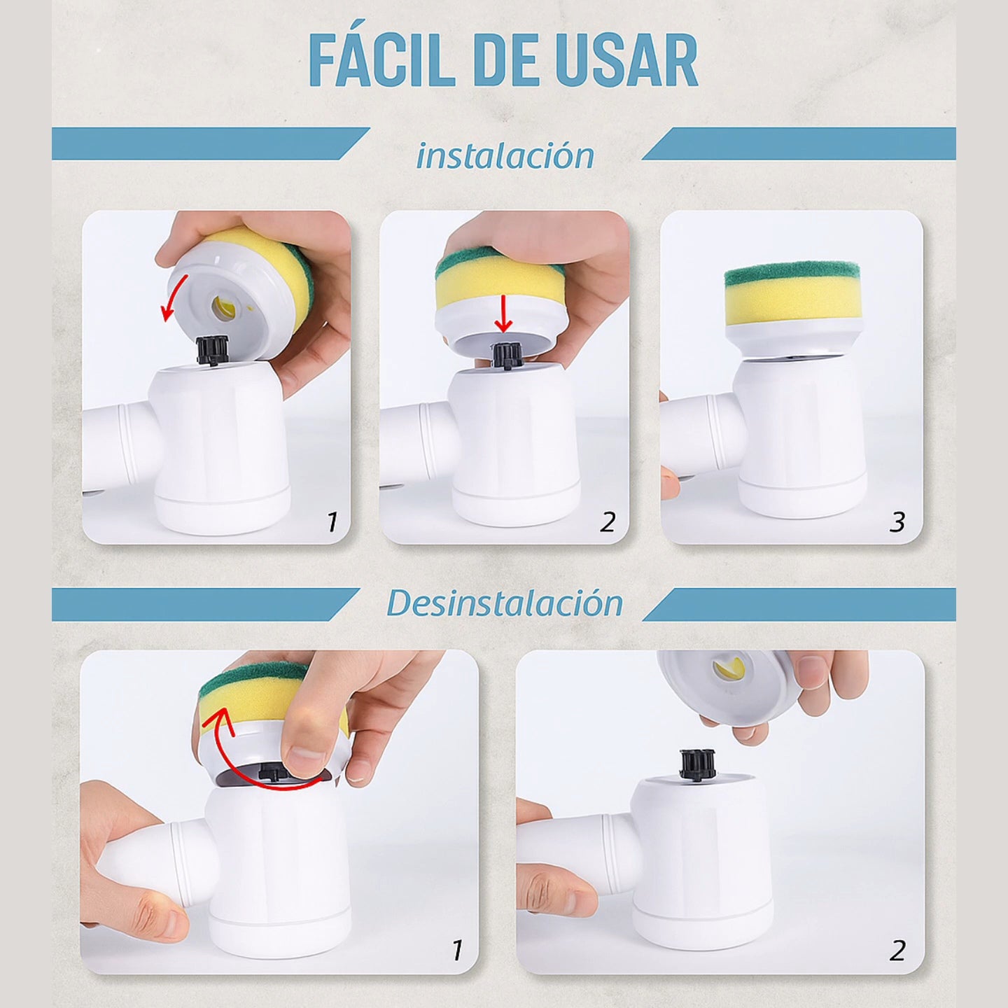 Este cepillo eléctrico cuenta con un sistema de acople rápido que permite cambiar los cabezales con facilidad. Ideal para limpiar sin esfuerzo diferentes superficies del hogar.