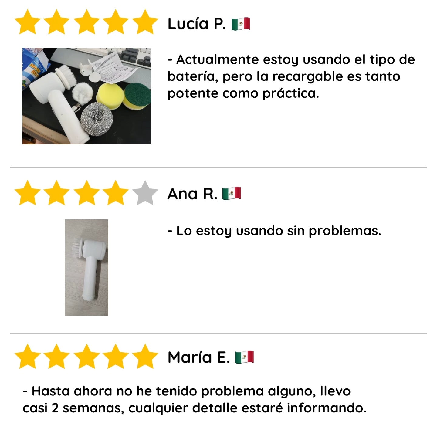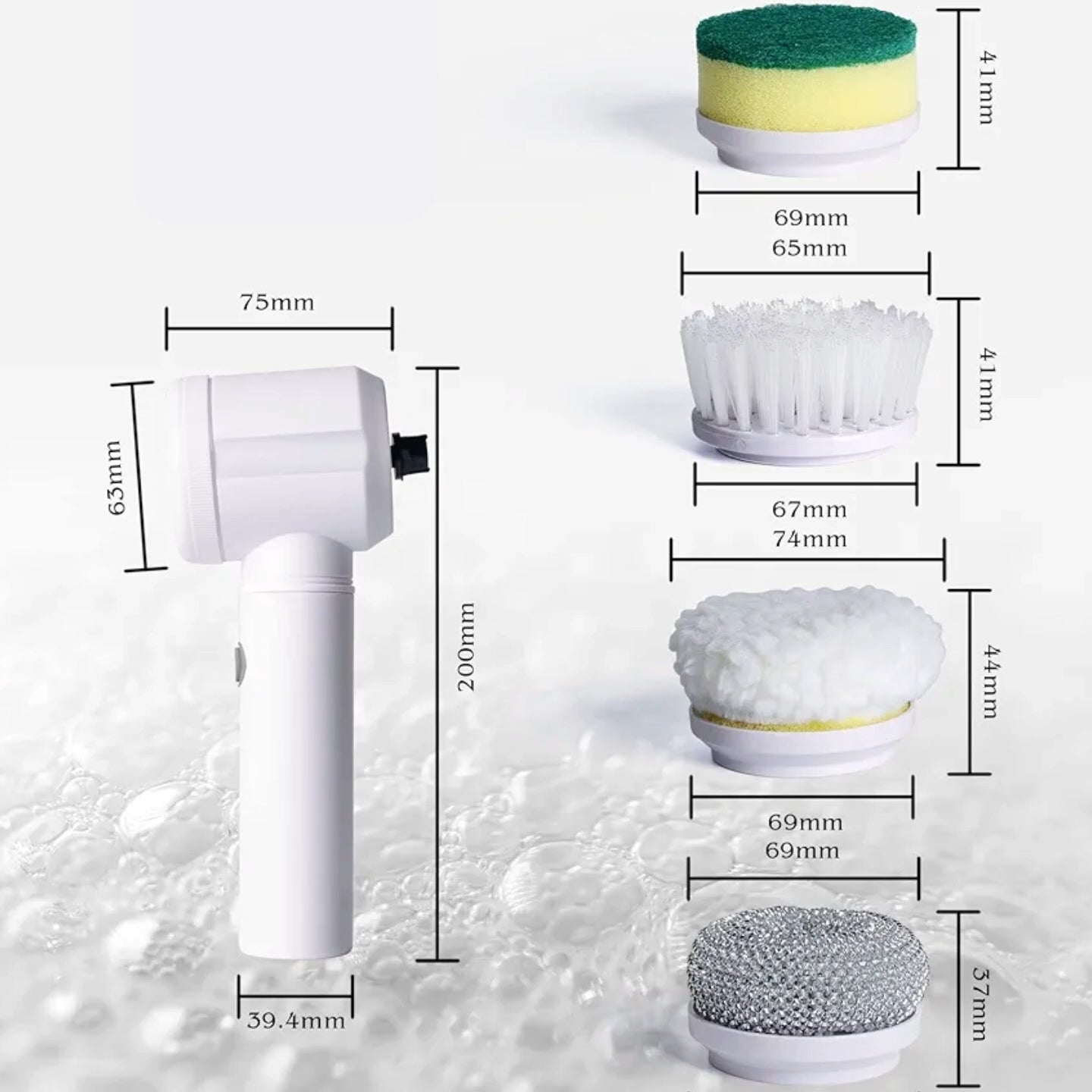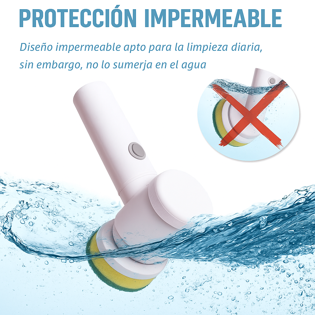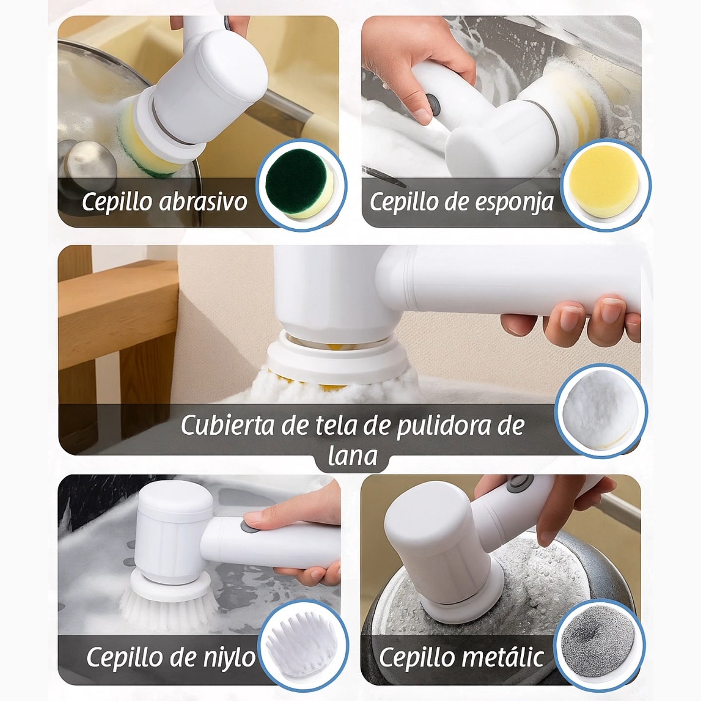 Incluye 5 cepillos intercambiables: abrasivo, esponja, tela pulidora de lana, cepillo de nylon y cepillo metálico. Cada uno diseñado para adaptarse a distintas superficies y dejar todo impecable sin esfuerzo.